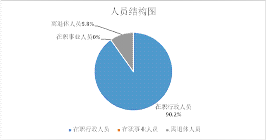 截止2019年底,本部门人员总编制111名,其中行政编制111名,事业编制0名;实有在职人员331人,正式职工178人,协警人员134人,其他基础服务工作临聘人员19人,离退休人员28人,遗属人员8人。(附饼状图)