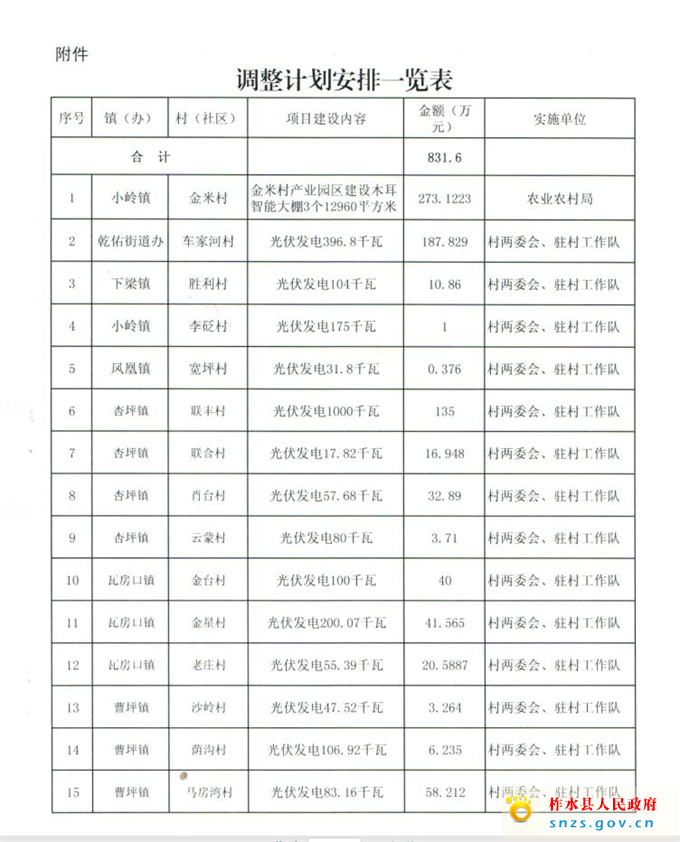 关于调整2019年小岭镇金米村产业园区木耳智能大棚项目资金的通知