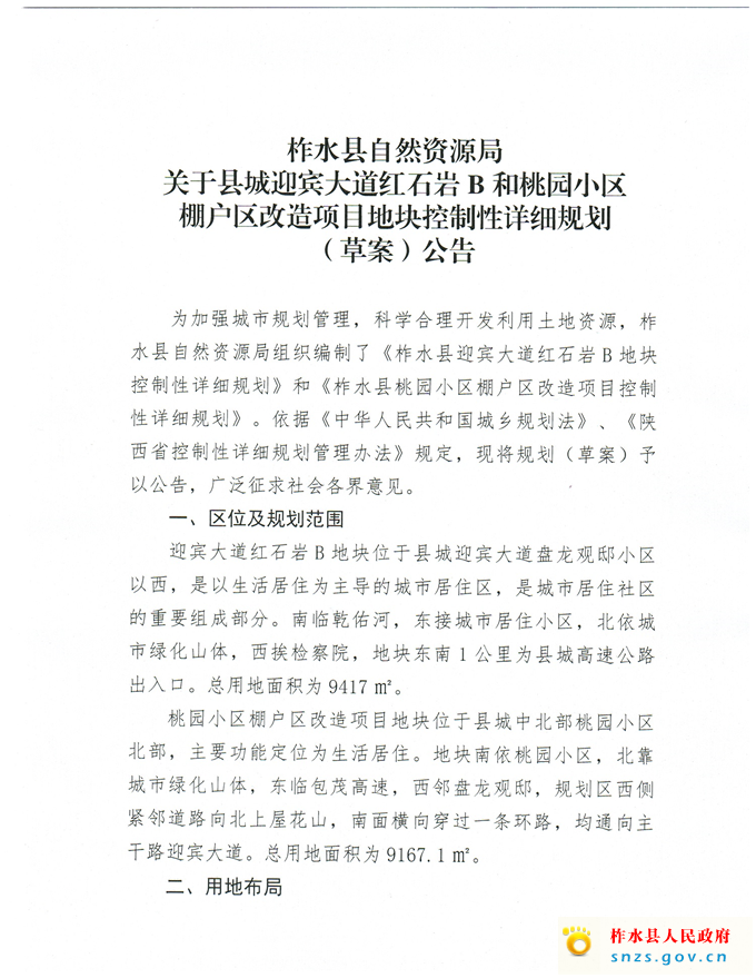 柞水县自然资源局关于县城迎宾大道红石岩B和桃园小区棚户区改造项目地块控制性详细规划(草案)公告