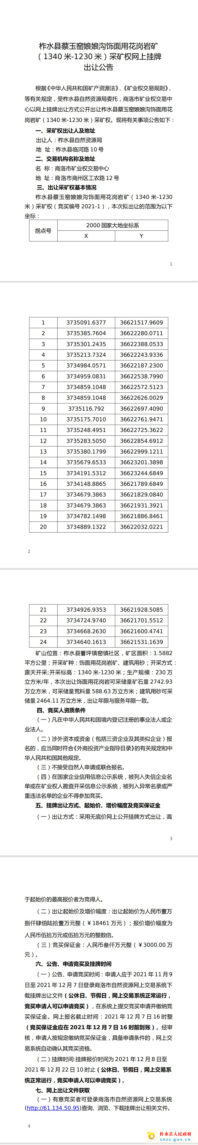 柞水县蔡玉窑娘娘沟饰面用花岗岩矿(1340米-1230米)采矿权网上挂牌出让公告