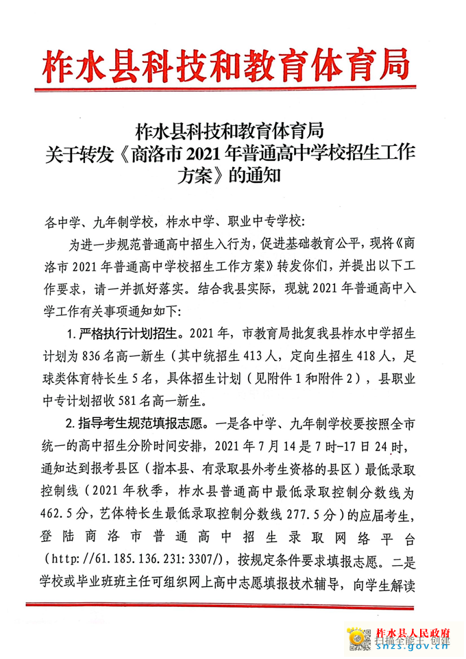 关于转发《商洛市2021年普通高中学校招生工作方案》的通知