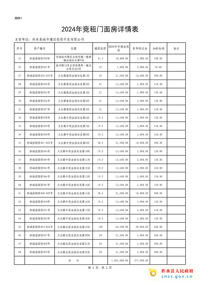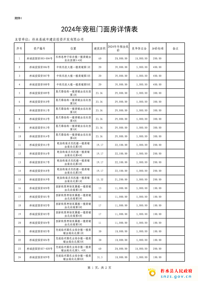 (3)年租金底价:参考上年定价标准,一房一价(详见附件1《2024年竞租门面房详情表》);