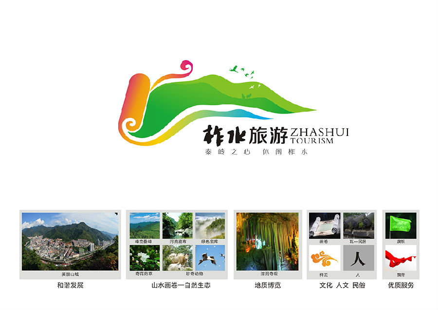 标志释义:标志以唯美的山水画卷造型为主要设计元素,形象而简洁地概括出柞水的山城地貌,同时体现各种生态奇观:峰峦叠嶂、河流水系、奇花异草、珍奇动物隐逸期间、时隐时现,使画面富有动感、生机盎然,极富畅爽博大的禅意。五彩斑斓的溶洞奇观,祥云飞卷的人文画卷,在标志的精妙设计中得以全面而确切的传达;欢迎的旗帜迎风招展,优质服务带给人们满意舒爽的旅游感受,让柞水的绿色宝库、深厚的民俗文化发挥得天独厚的优势,使经济发展和旅游人文飞越畅爽、如意中天。